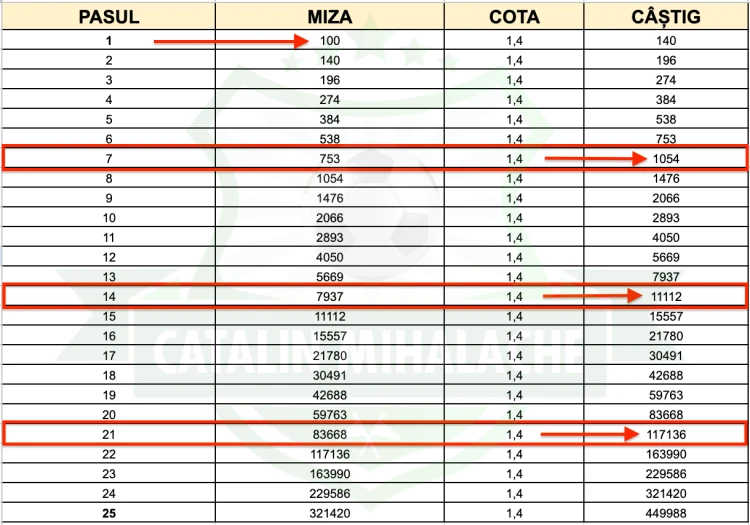 Dacă verifici imaginea de mai sus, poți verifica sumele de bani pe care le poți câștiga în funcție de numărul de pariuri câștigătoare consecutiv, prin reinvestirea câștigului în sistem ALL-IN! De exemplu, după 5 pariuri poți avea de 5 ori mai mulți bani în cont, iar dacă reușești provocarea supremă de 25 de pariuri consecutive, poți avea de 4500 de ori mai mulți bani față de miza inițială dacă respecți STAKING PLAN-ul recomandat.