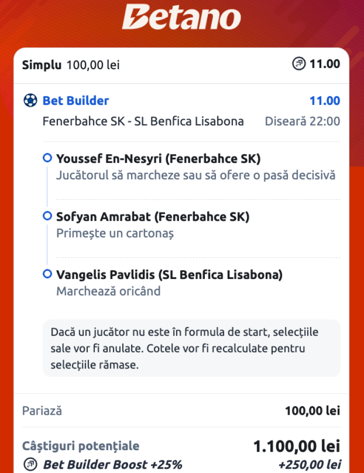 Pe lângă pariul principal, am încercat cu miză mai mică și un Bet Builder BOOST care ne mărește câștigul cu 25%, oferindu-ne o cotă reală de 13.50 în loc de 11.00 unde am mers pe 3 selecții strict pe piețele de jucători! Îl puteți vedea mai jos 👇